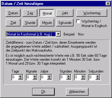 Im unteren Bereich (Zeitdifferenz) können Sie einstellen, daß der ausgegebene Wert um x Tage, Stunden etc. vom Zeitpunkt des Makroaufrufes abweicht. Wenn Sie also den Wochentag von vor 3 Tagen benötigen, klicken Sie Wochentag, wählen das gewünschte Format aus und stellen bei Tage (unten) -3 ein.