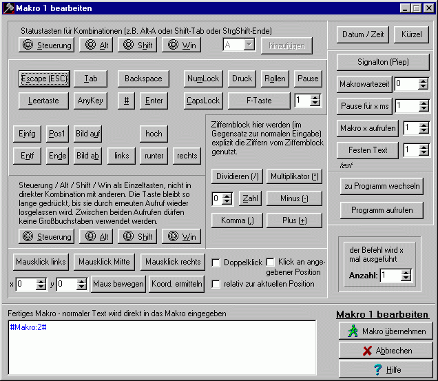 Der Makroeditor dient der vereinfachten, übersichtlichen (soweit bei der Komplexität möglich) Erstellung bzw. Bearbeitung von Makros. Eine ausführliche Beschreibung aller möglichen Steuerbefehle finden Sie hier, im weiteren Verlauf dieser Hilfeseite werden nur nochmal die wichtigsten Punkte angesprochen.